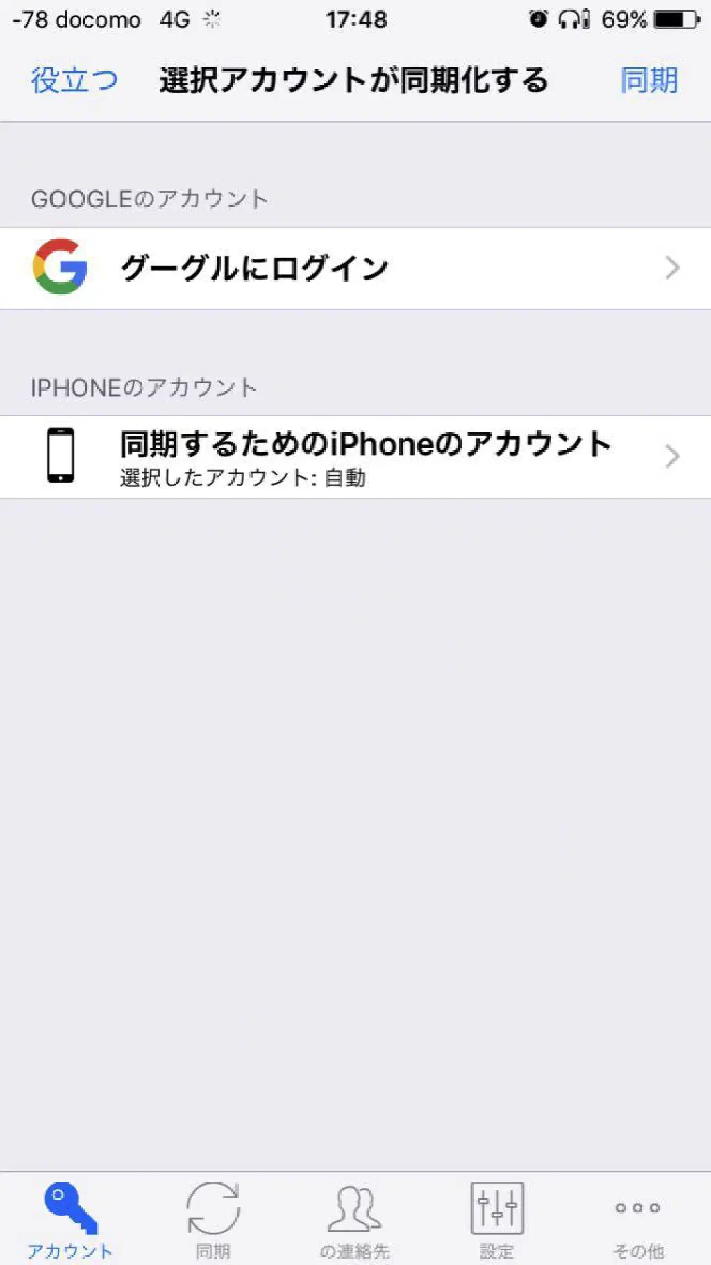 「Contacts Sync」を起動したら、「アカウント」タブを選択し、「グーグルにログイン」をタップし、連絡先を同期したいGoogleアカウントにログインします。