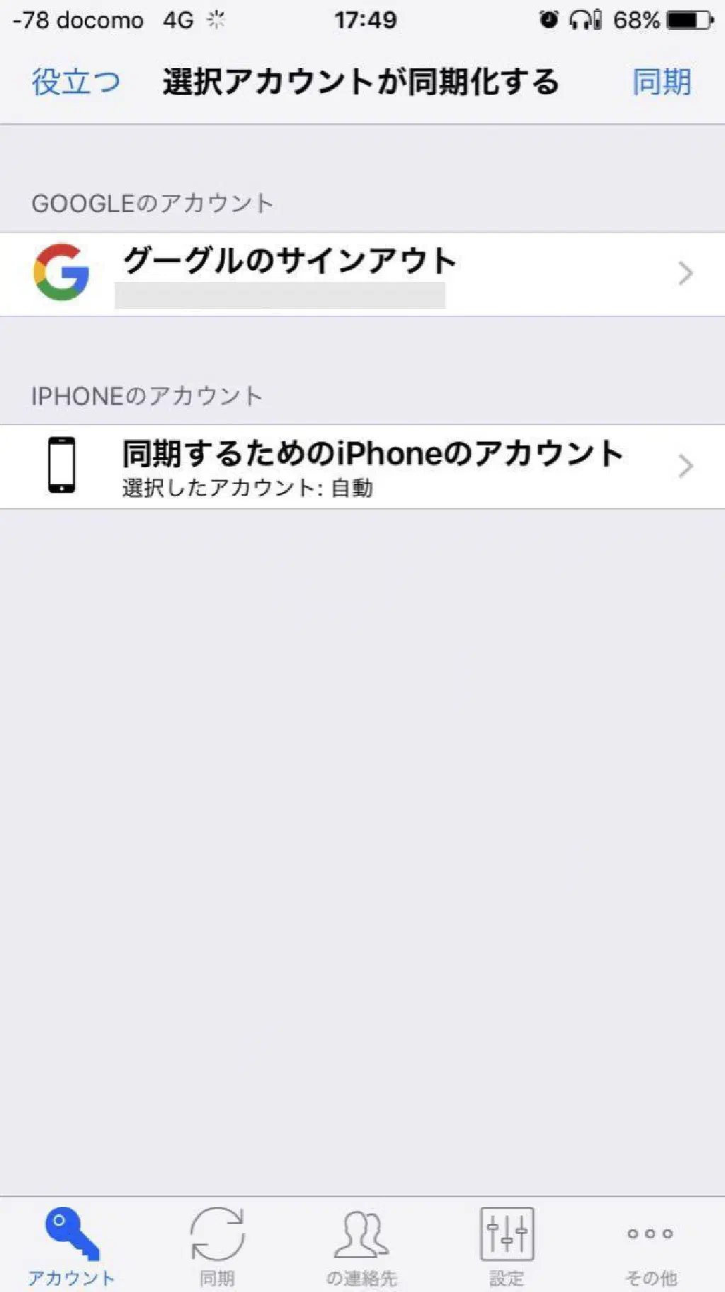 ログインに成功すると「Googleのサインアウト」という表現に変化します。続いて「同期するためのiPhoneのアカウント」をタップします。