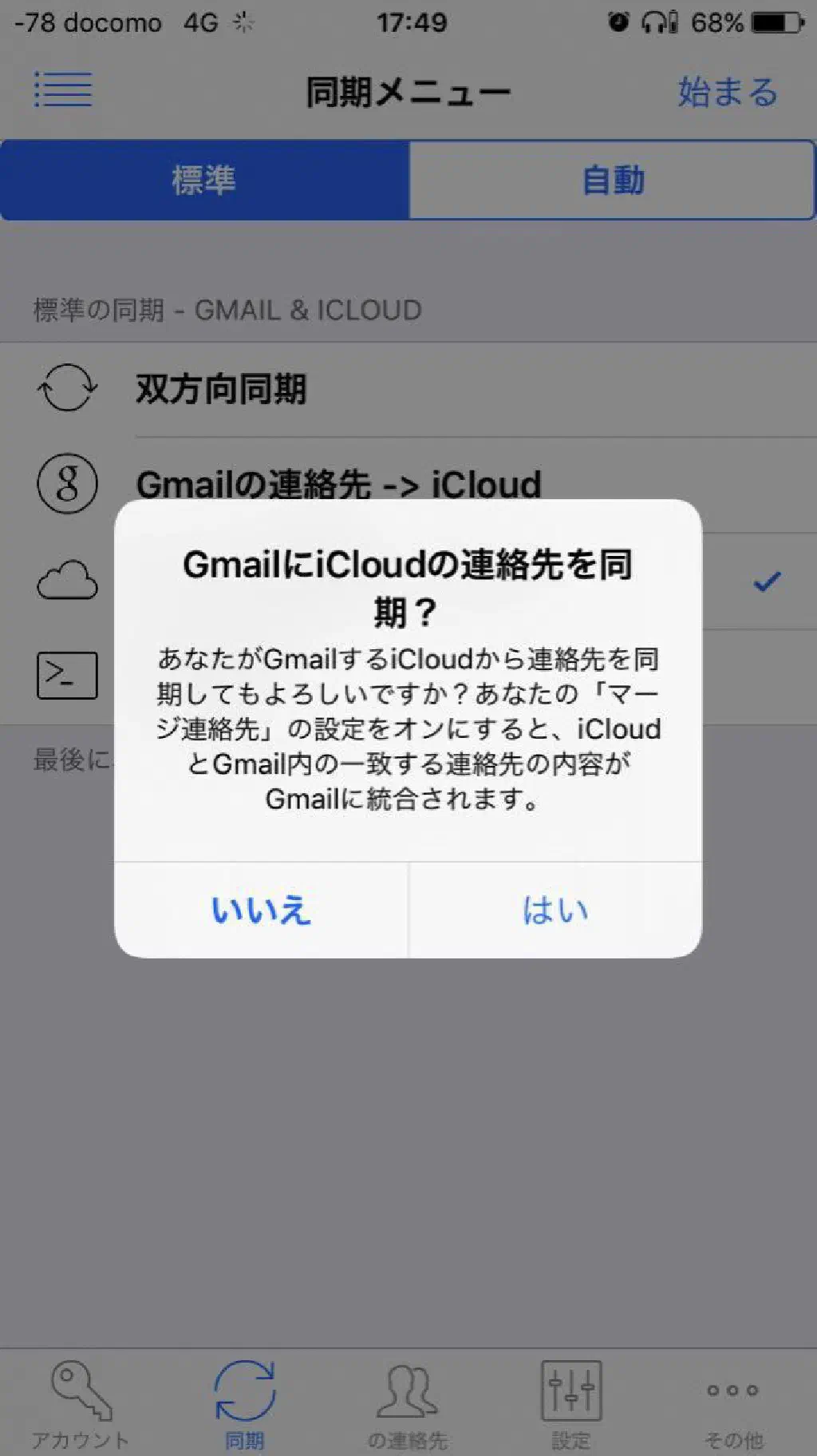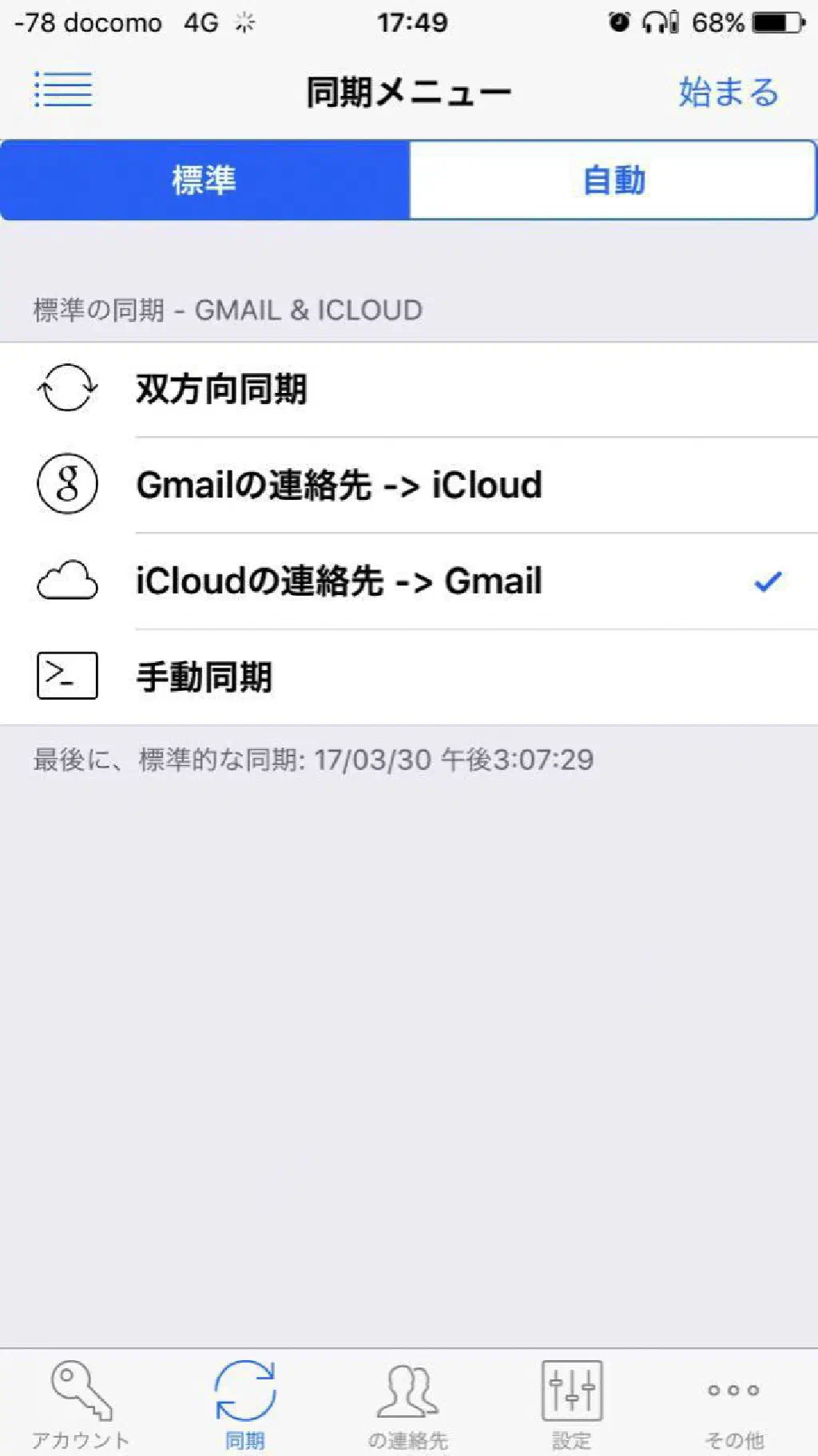 続いて「同期」タブをタップします。今回の場合、iCloudに保存した連絡先をGoogleアカウントにコピーしたいため、「iCloudの連絡先 -> Gmail」を選択します。選択したら「始まる」をタップします。