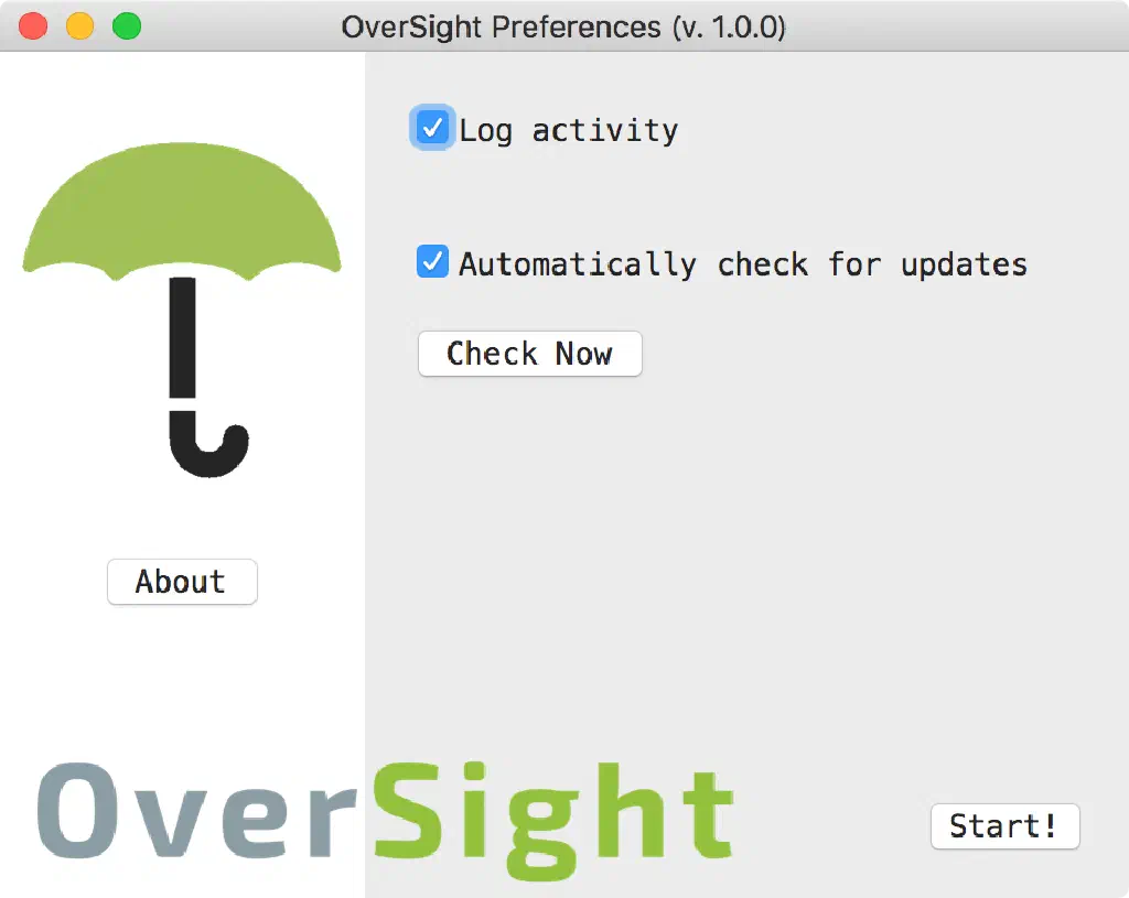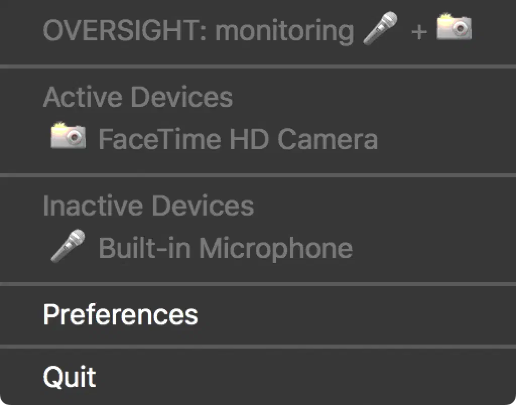 「OverSight」はメニューバーに常駐するアプリケーションです。停止、起動はメニューバーから行います。「OverSight」を起動したい場合は、メニューバーから「Preferences」を選択します。