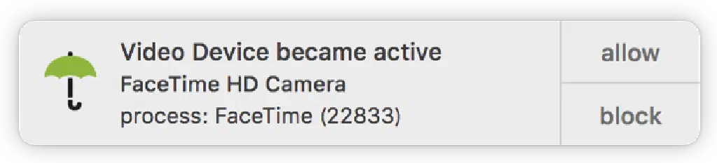 「OverSight」が起動している状態で、「FaceTime」が起動すると、macOS の通知の機能によりこのような画面が右上に表示されます。また、iSight カメラが起動されるため LED ライトが点灯することを覚えておきましょう。もし、この iSight カメラの使用が不正なものであった場合には「block」をクリックします。