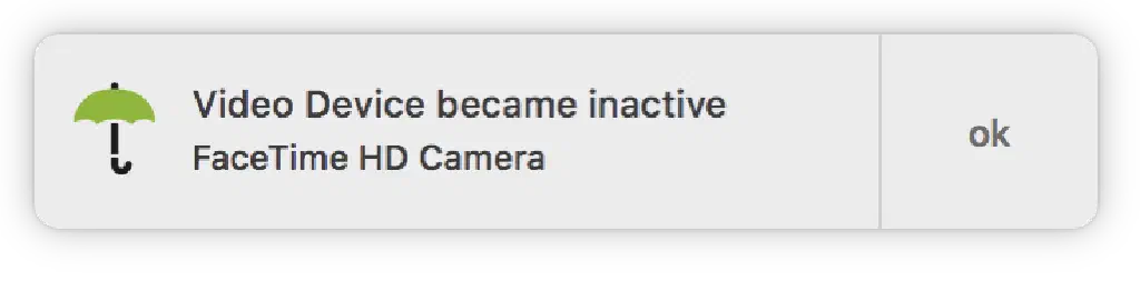 すると、FaceTime が終了し、このように「Video Device became inactive」と表示され、iSight カメラの使用が防止されました。また、同様に Mac に内蔵されているマイクの使用を検知することもできます。