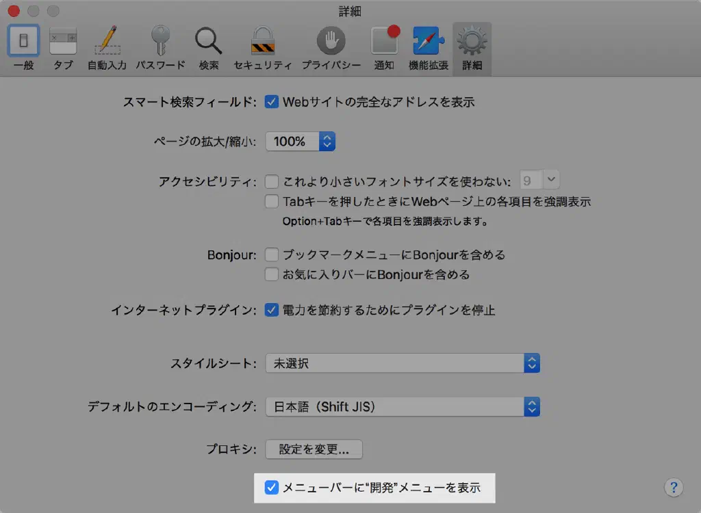 開発者向けメニューを有効化するためには、Safariの環境設定(⌘+,)を開き、「詳細」タブから「メニューバーに"開発"メニューを表示」のチェックボックスをオンにします。