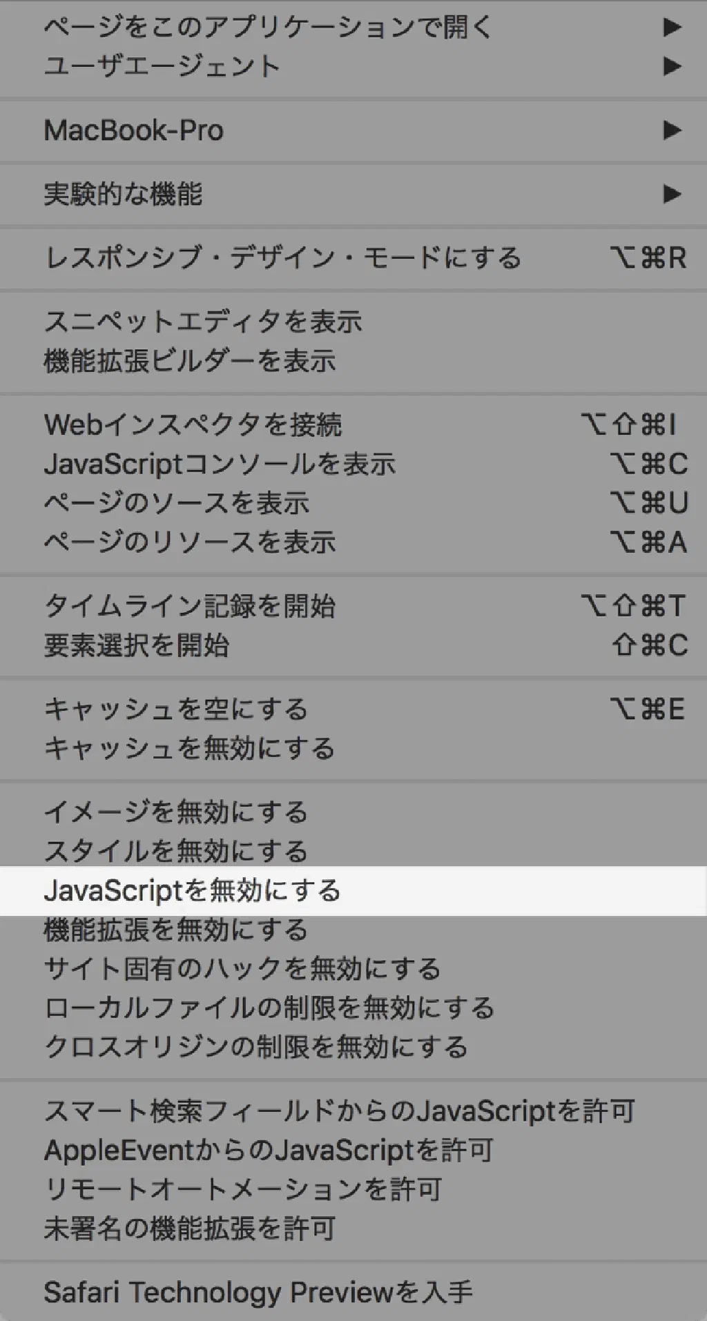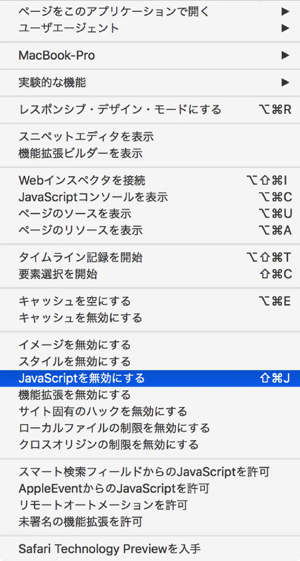 Safariには標準で開発者向けのメニューが用意されていますが、通常使用されないため有効化しておく必要があります。この開発者向けメニューの中にJavaScriptを簡単に無効化できる項目があります。