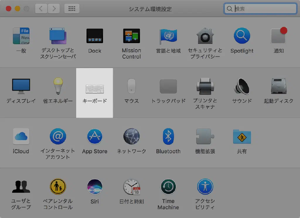 「システム環境設定」を開き、「キーボード」をクリックします。