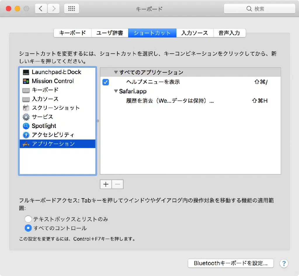 「ショートカット」タブを選択し、サイドメニューから「アプリケーション」を選択してください。続いて、「+」ボタンでショートカットを追加します。