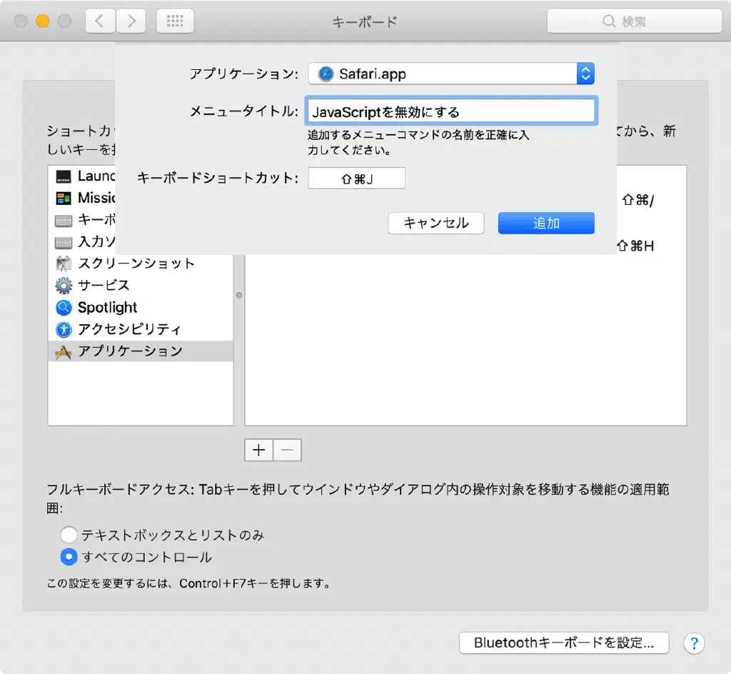 「アプリケーション」は「Safari.app」、メニュータイトルは「JavaScriptを無効にする」(この項目はSafariの「開発」メニューに表示されているメニューを一言一句間違えないように入力してください。今回は問題ありませんが、三点リーダー等が含まれている場合は、それも合わせて入力する必要があります)、キーボードショートカットは他と被らない任意なものにしてください。今回は、JavaScriptの頭文字をとって、⇧+⌘+Jとしました。