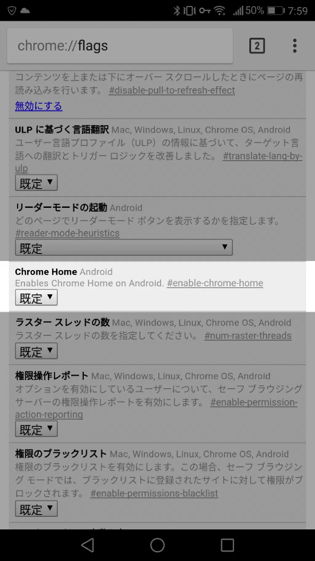 画面を下にスクロールすると、「Chrome Home」という項目があります。デフォルトでは「既定」(無効)となっています。「既定」のプルダウンをタップします。