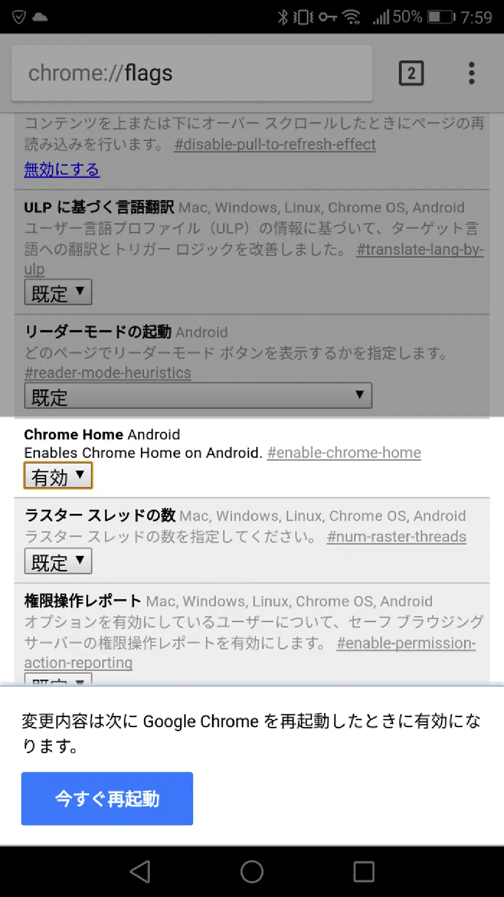 プルダウンを「有効」に変更すると、Chromeの再起動を促すダイアログが表示されますので、「今すぐ再起動」をタップしてChromeを再起動します。