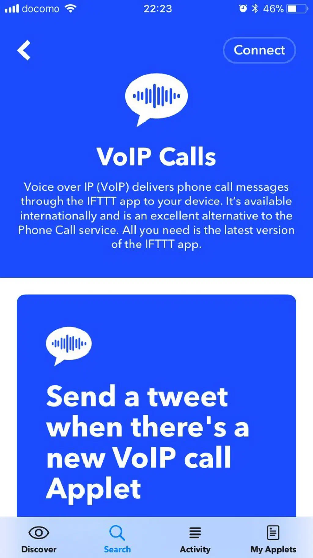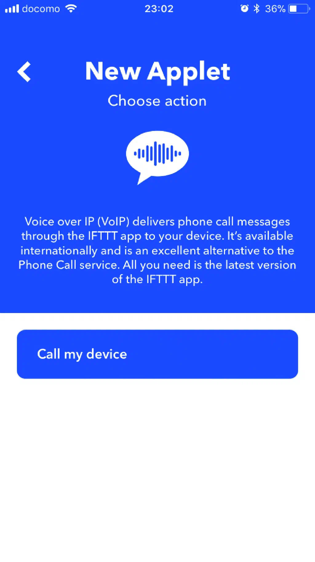検索ボックスにキーワード(たとえば、「VoIP」)を入力して、トリガーとなるサービスを検索します。「VoIP Calls」サービスで実行できるアクションは記事執筆時点では「Call my device」(着信)のみです。
