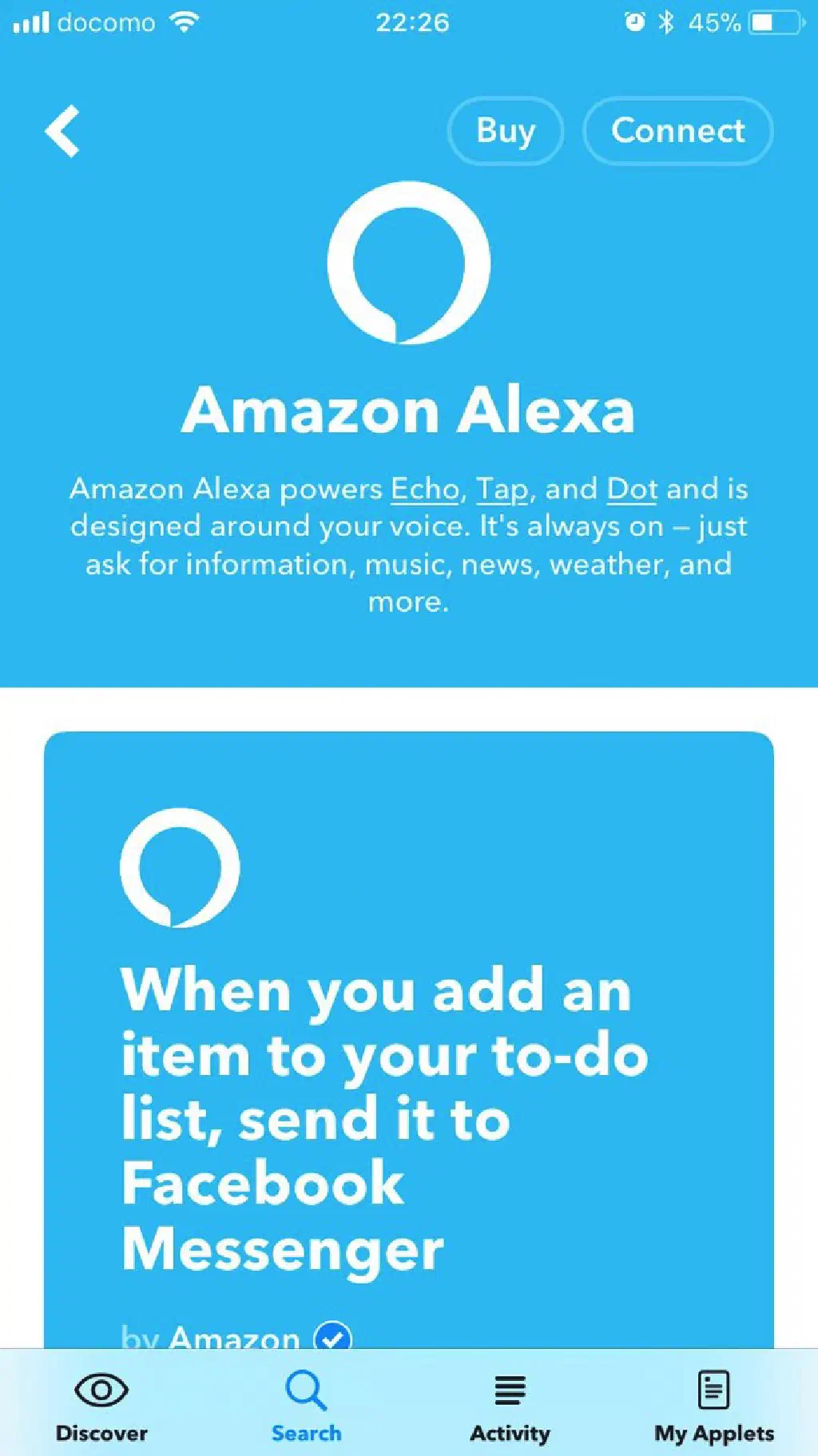 先ほどと同様の手順で「Amazon Alexa」を探します(検索キーワードに「Alexa」と入力してください。「Echo」ではヒットしませんので注意してください)。続いて、「Amazon Alexa」のサービス画面において、「Connect」をタップします。Safariが起動し、Amazonアカウントによる認証画面が開きますので、「Amazon EchoにサインインしているAmazonアカウントと同一のアカウントでサインインして、IFTTTとの連携を許可しておきます。