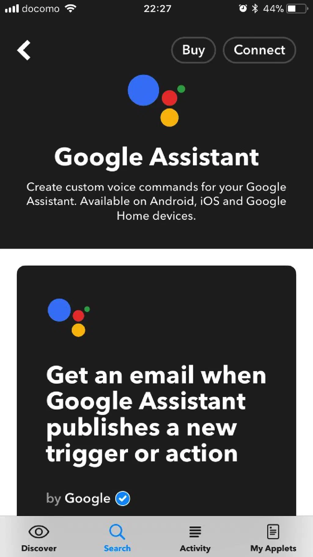 先ほどと同様の手順で「Google Assistant」を探します(検索キーワードに「Google Assistant」と入力してください)。続いて、「Google Assistant」のサービス画面において、「Connect」をタップします。Safariが起動し、Googleアカウントによる認証画面が開きますので、Google HomeにサインインしているGoogleアカウントと同一のアカウントでサインインして、IFTTTとの連携を許可しておきます。