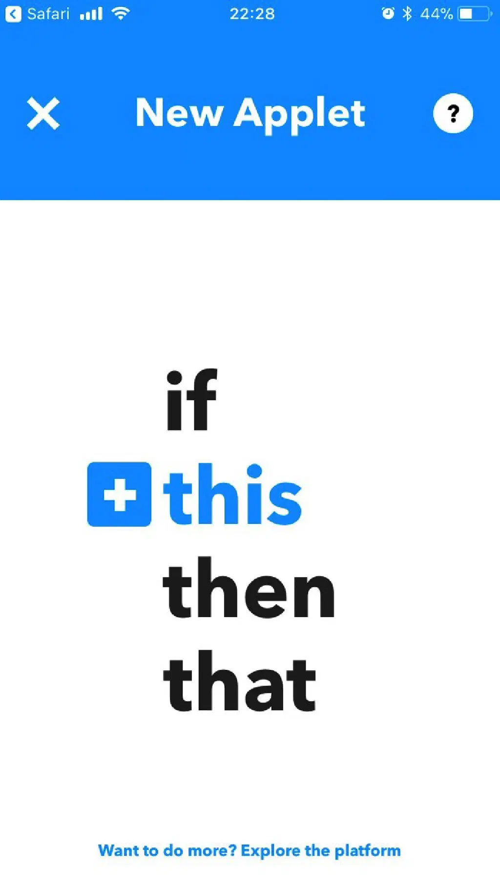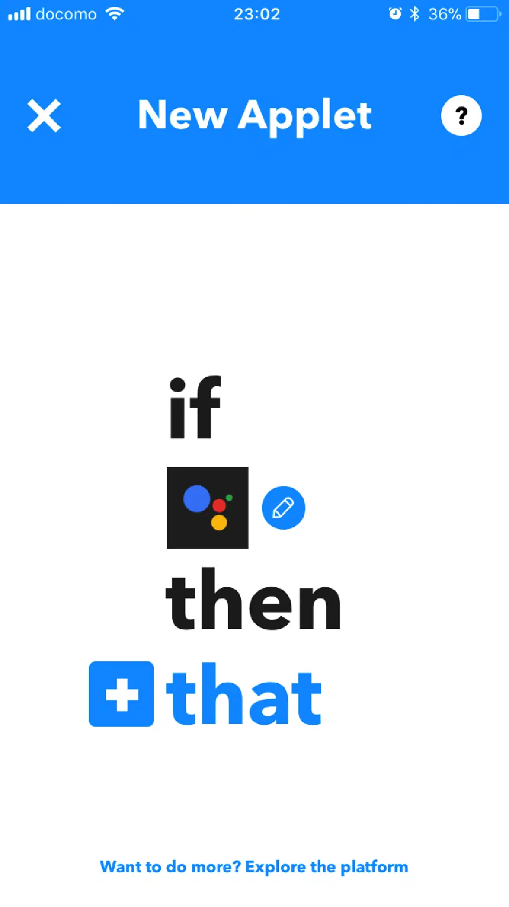 まず、連携元となるトリガーを作成します。今回の場合、「Google Home」(IFTTTでは、Google Assistant)がthis(トリガー/契機)となり、「VoIP Calls」がthat(アクション)です。「this」をタップします。