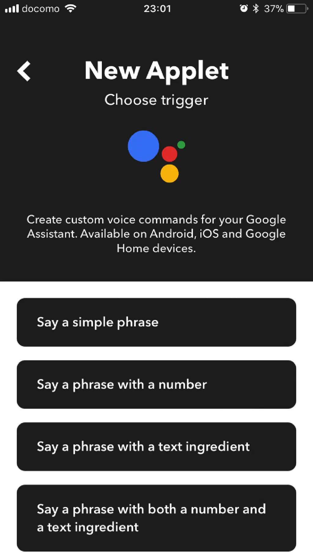 今回の目的はGoogle HomeにiPhoneを見つけてもらうだけなので、「Say a simple phrase」を選択します(特定のキーワードに対してGoogle Homeが反応する)。