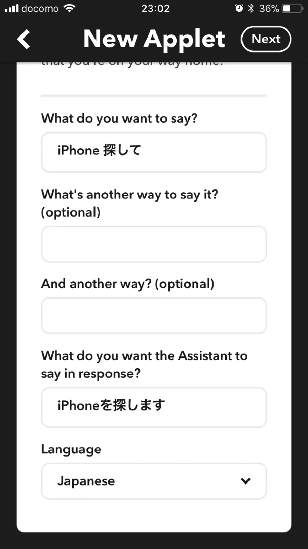 さまざまな入力項目がありますが、必須の項目は「What do you want to say?」と「What do you want the Assistant to say in response?」のみです。「What do you want to say?」に「iPhone 探して」と入力します。ポイントは、記事執筆時点ではGoogle Homeの日本語の助詞(てにをは)の認識能力がやや精度に欠けるため、「iPhoneを探して」ではなく「iPhone 探して」のように単語を組み合わせて入力することです。筆者は「iPhone 探して」と単語と単語の間に半角スペースを使用しました。