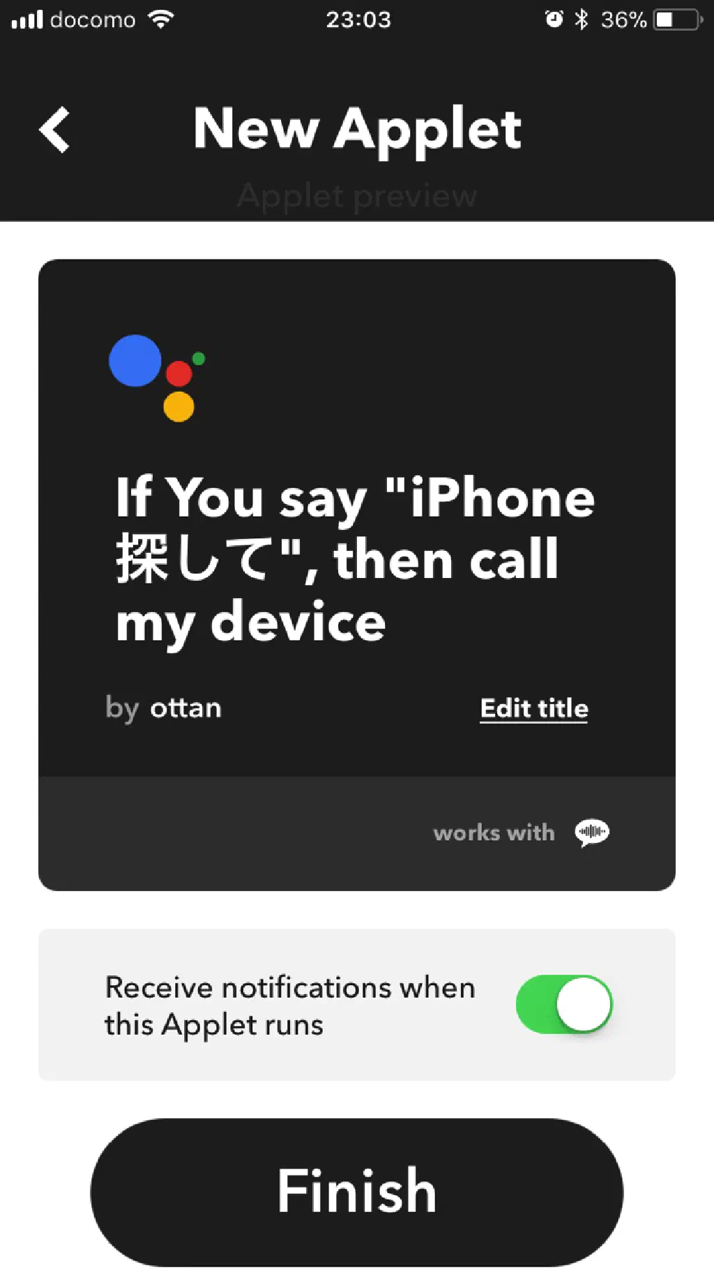 最後に「Finish」をタップしてアプレットの作成完了です。
