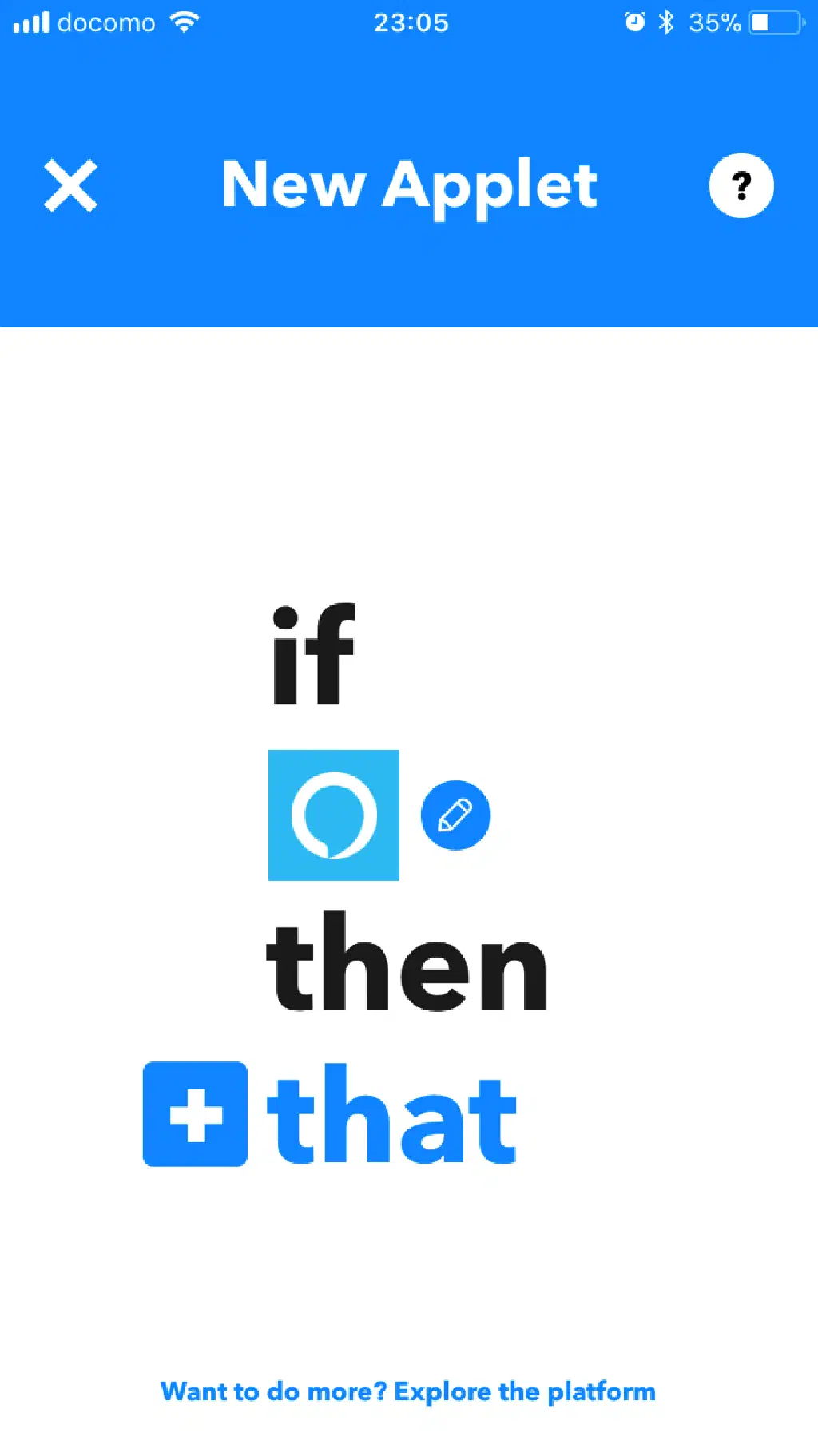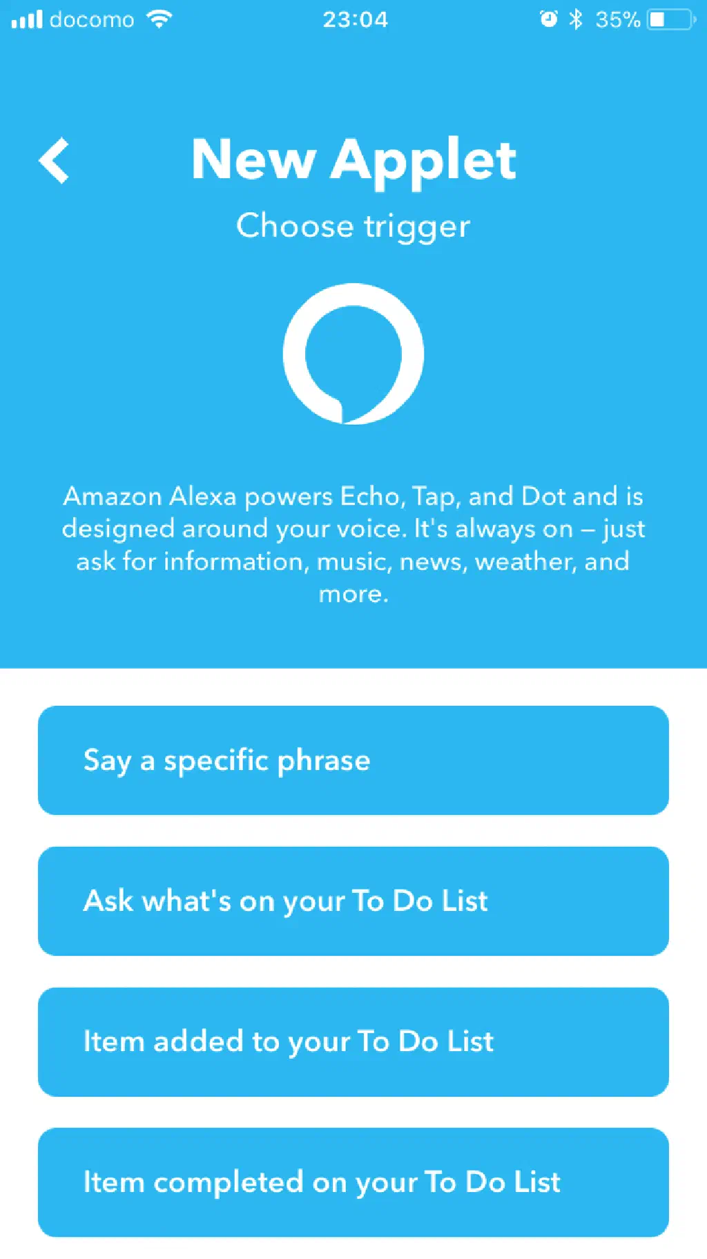this(トリガー/契機)で「Amazon Alexa」サービスを選択します。Google Homeの場合と同様に、今回の目的はGoogle HomeにiPhoneを見つけてもらうだけなので、「Say a specific phrase」(特定のキーワードに対してAmazon Echoが反応する)を選択します。