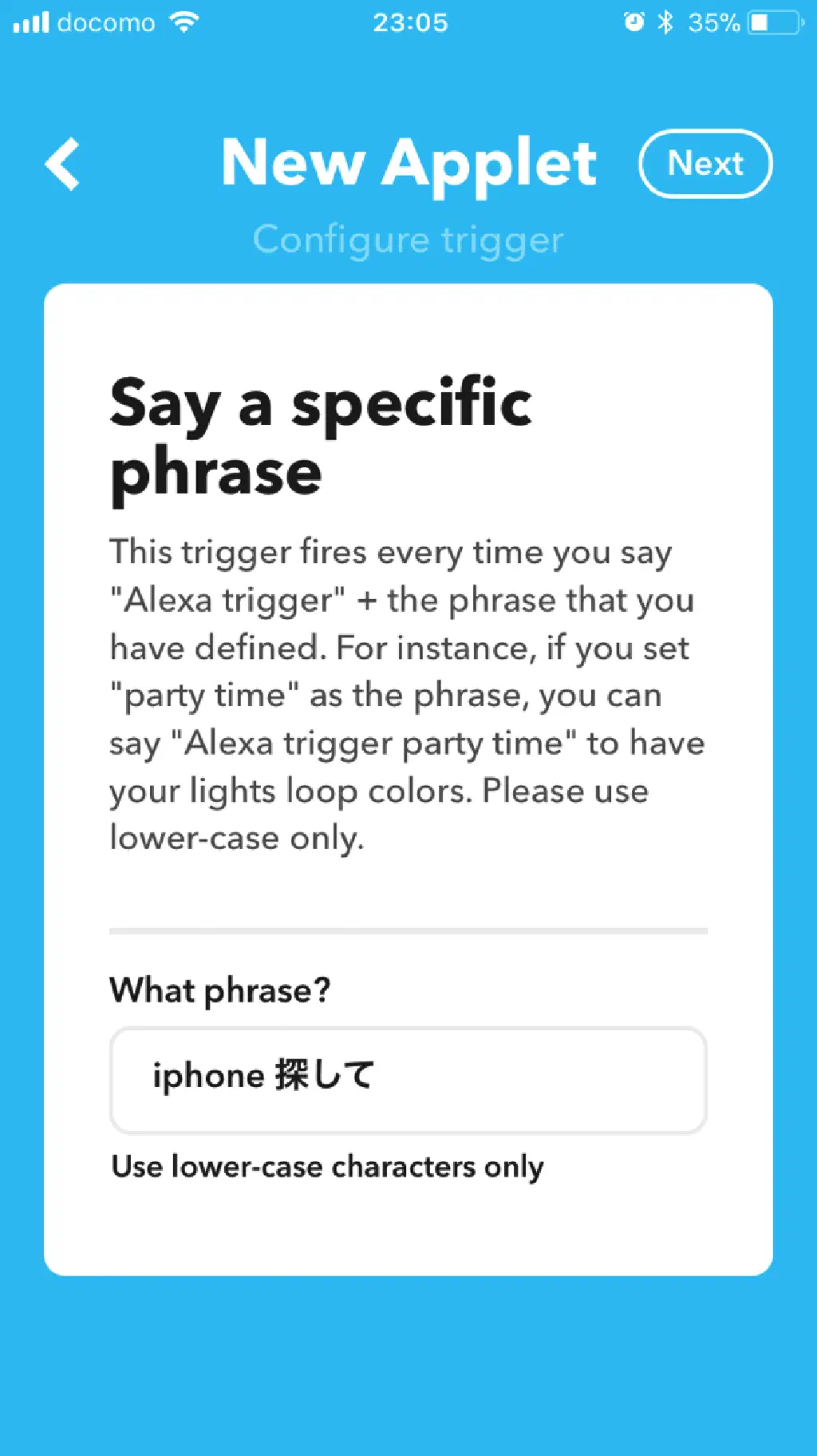 Amazon Alexaの場合は、Google Homeと比べて単純です。キーワードを入力するのみです。「Use lower-case characters only」とありますが、日本語を入力することもできます。ただし、Google Homeと同様に、記事執筆時点では日本語の助詞(てにをは)の認識能力がやや精度に欠けるため、「iphoneを探して」ではなく「iphone 探して」のように単語を組み合わせて入力することです。さらに注意したいことは、「Use lower-case characters only」とあるため「iPhone」など大文字(今回の場合は「P」)は使用できません。すべて小文字で入力します。日本語も認識しやすい単語が良いでしょう。今回は「iphone 探して」としました。