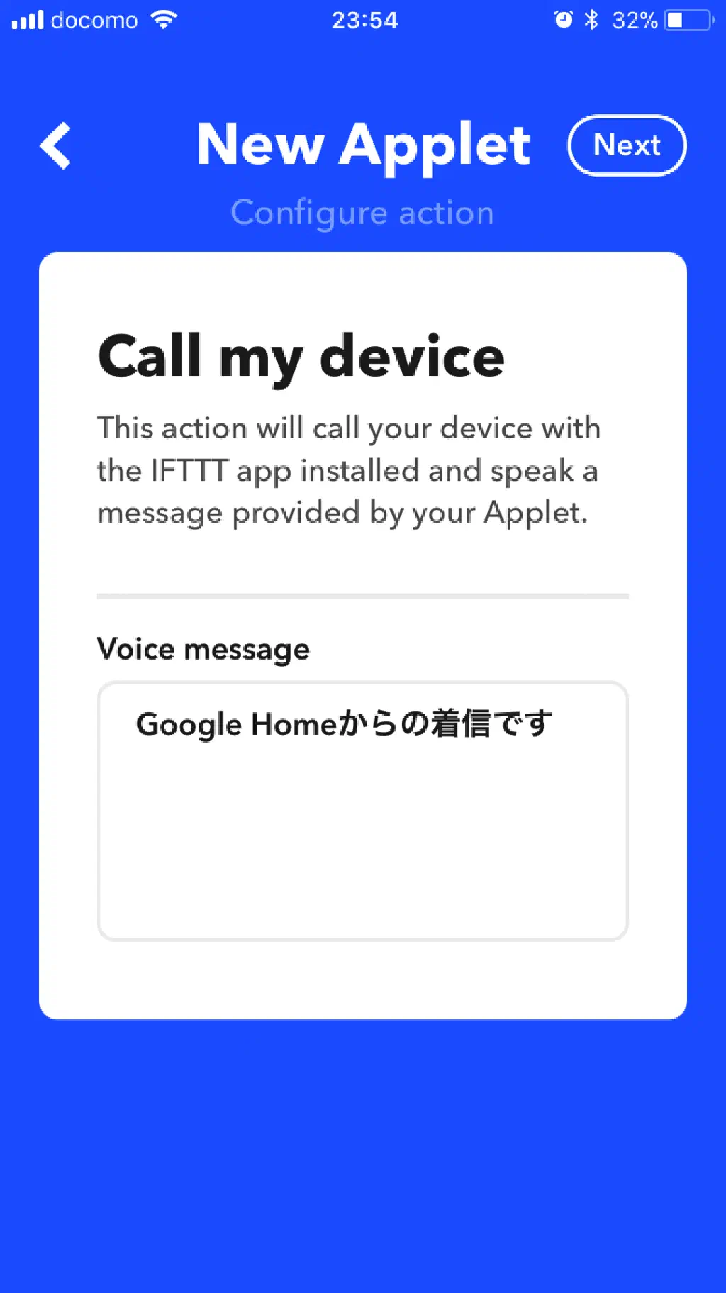 iOSデバイスで応答した際に流れる音声メッセージを入力します。説明は英語ですが、日本語文字列でも構いません。流暢な日本語で応答してくれます。空白にはできない(無言電話も怖い)ため、任意の文字列を入力します。