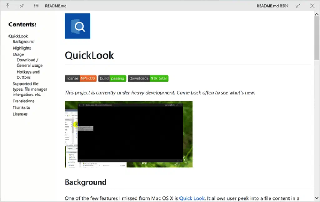 GitHub で公開されている Markdown 形式の「README.md」も綺麗に表示されます。なお、プレビューしたファイルは、関連付けされているアプリケーションでそのまま開くこともできます。