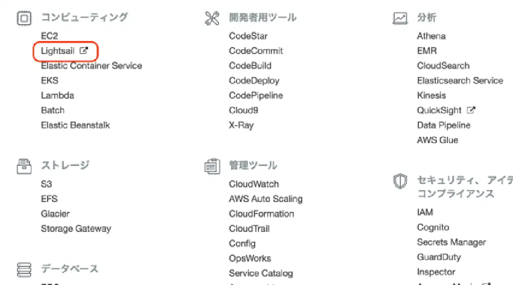 AWSのマネジメントコンソールにログインしたら、サービス一覧から「Lightsail」を選択します。