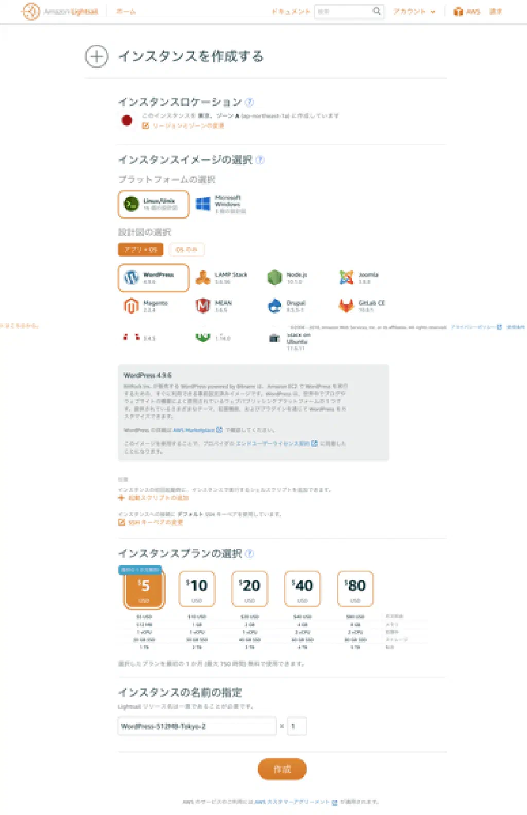 インスタンスロケーションは、「ap-northeast」(東京リージョン)を選択します。プラットフォームは、「Linux」、アプリケーションは「WordPress」、インスタンスプランは「$5」を選択して、「作成」をクリックします。