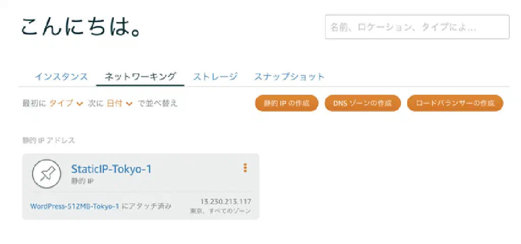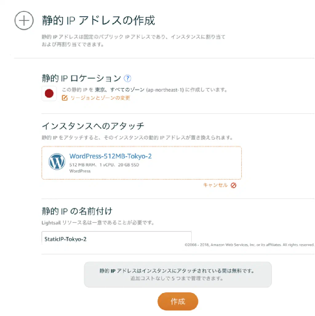 「静的IPロケーション」は、インスタンスと同様のリージョン(ap-northeast-xx)を選択します。割り当てるインスタンスを選択し、「作成」をクリックします。