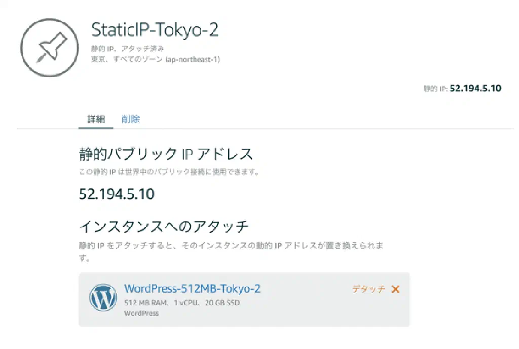 AWS Lightsailのインスタンスには、グローバルIPアドレスを1つまで無料で割り当てることができます。しかし、デフォルトではインスタンスを再起動するたびにIPアドレスが変更されてしまうため、静的なIPアドレスを割り当てる必要があります。