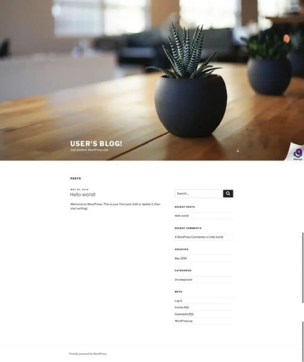 なお、デフォルトのWordPressのトップページにアクセスすると、右下に「Manage」というアイコンが表示されると思いますが、一般のユーザー(読者)には不要な情報ですので、この段階で無効化しておきましょう。