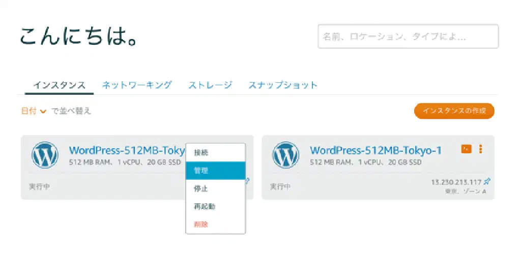 というわけで、作成したインスタンスに対してSSHで接続し、ホームディレクトリを参照する必要があります。作成したインスタンスをクリックして、「管理」をクリックします。
