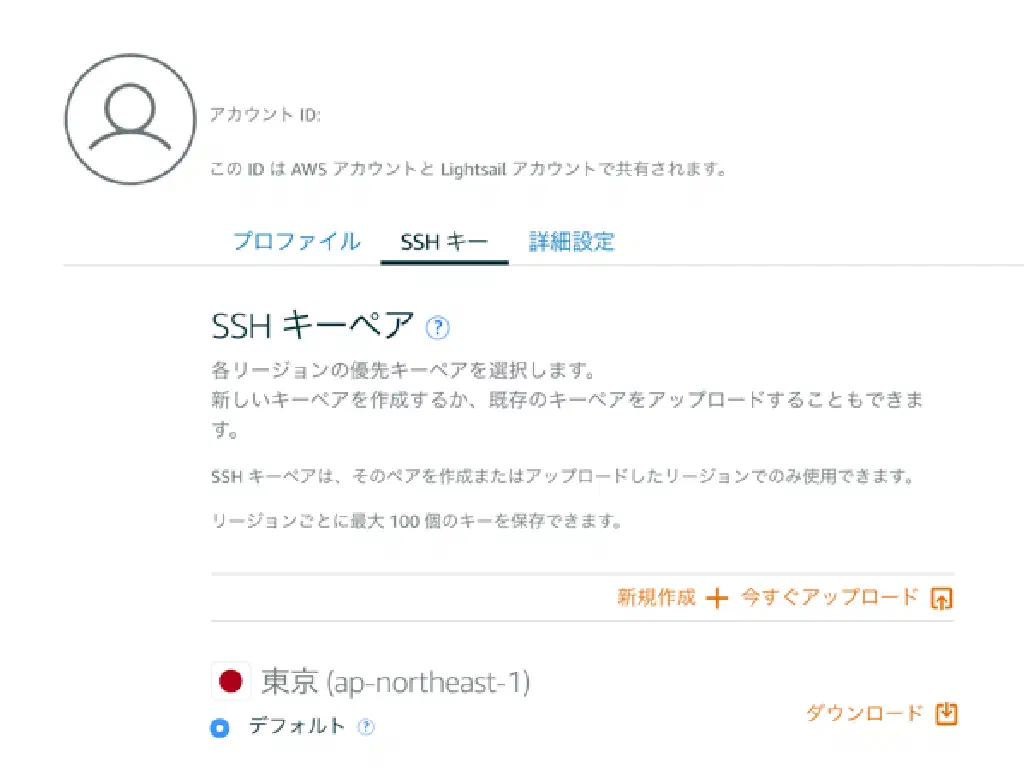 公開鍵認証で使用する公開鍵、秘密鍵は自分で作成したものを使用することもできますし、デフォルトで用意されている秘密鍵をダウンロードして使用することもできます。今回はデフォルトで用意されている鍵を使用します。「デフォルト」と書かれた横の「ダウンロード」をクリックします。秘密鍵がダウンロードされます。秘密鍵は漏洩しないように、また第三者と共有することがないようにしっかり管理しておく必要があります。