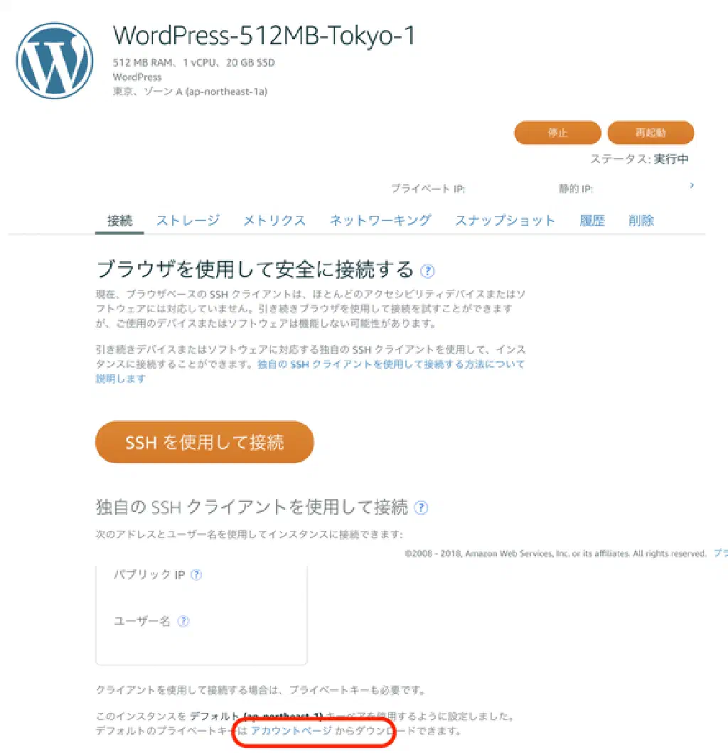Lightsailのインスタンスに接続する方法としては、ブラウザ(コンソール)から接続する方法と、公開鍵認証方式でローカルのターミナル等からアクセスする方法がありますが、ここでは後者の方法でアクセスします。アクセスするためのユーザー名、IPアドレスは上記の画面で確認できます。アクセスするための秘密鍵を入手する必要がありますが、上記の「アカウントページ」と書かれたリンクからダウンロードできます。