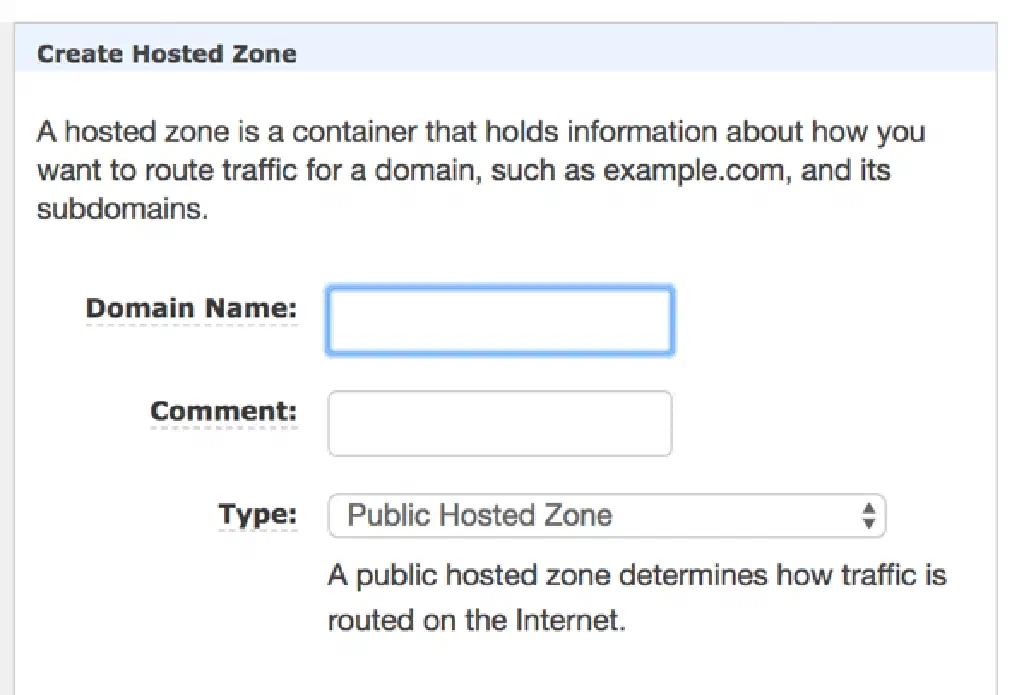 「Create Hosted Zone」をクリックします。はじめてRoute 53にアクセスした場合、上記の画面は表示されないかもしれません。「Create Hosted Zone」と書かれたボタンを見つけてクリックしてください。