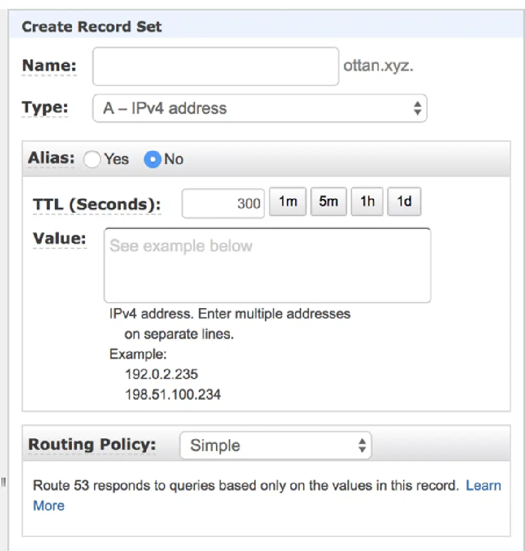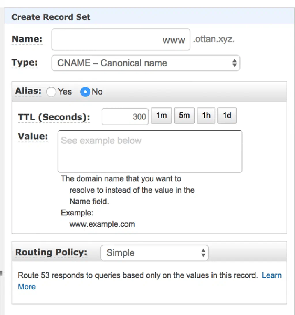 続いて、「www.ottan.jp」と「ottan.jp」の両方でアクセスを可能にするために、「CNAME」レコードを作成します。「Create Record Set」ボタンをクリックします。「Name」に「www」、「Type」に「CNAME - Canonical name」、「Value」に事前に取得したドメイン名を設定します。