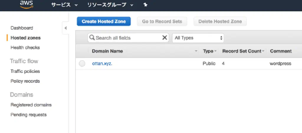 「Domain Name」にあらかじめ取得したドメイン名、「Comment」は任意、「Type」は「Public Hosted Zone」を選択し、作成します。