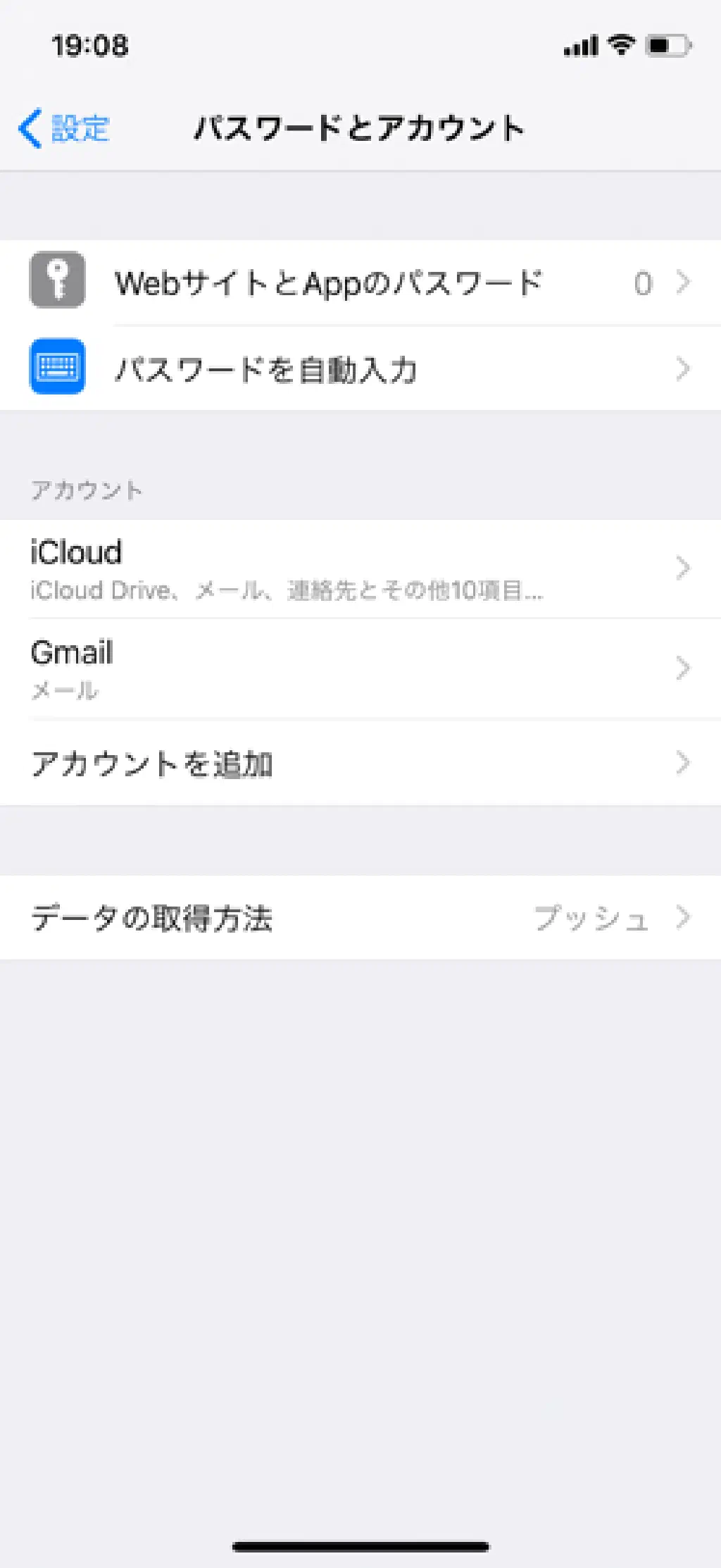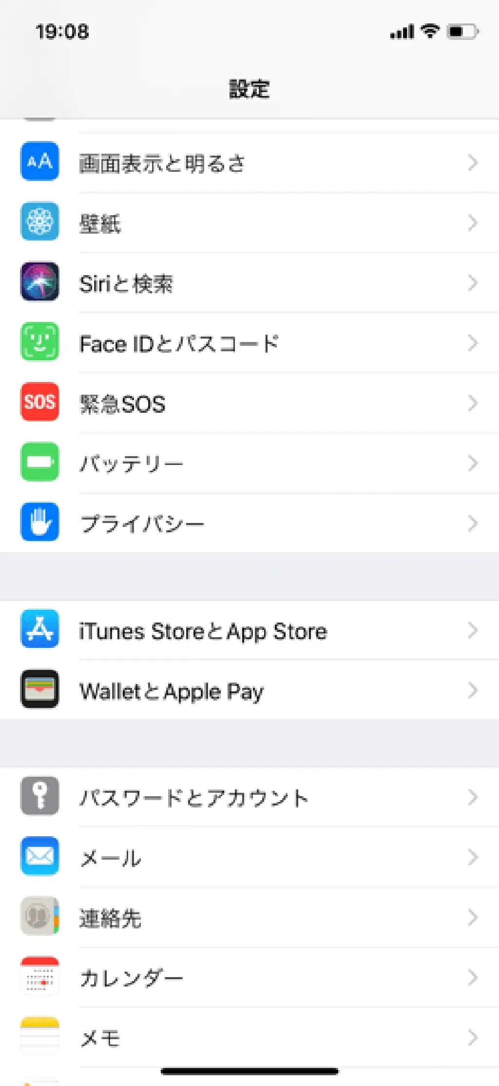 iOS 12にアップデートしたら、まずは「設定」を開きます。「パスワードとアカウント」をタップします。