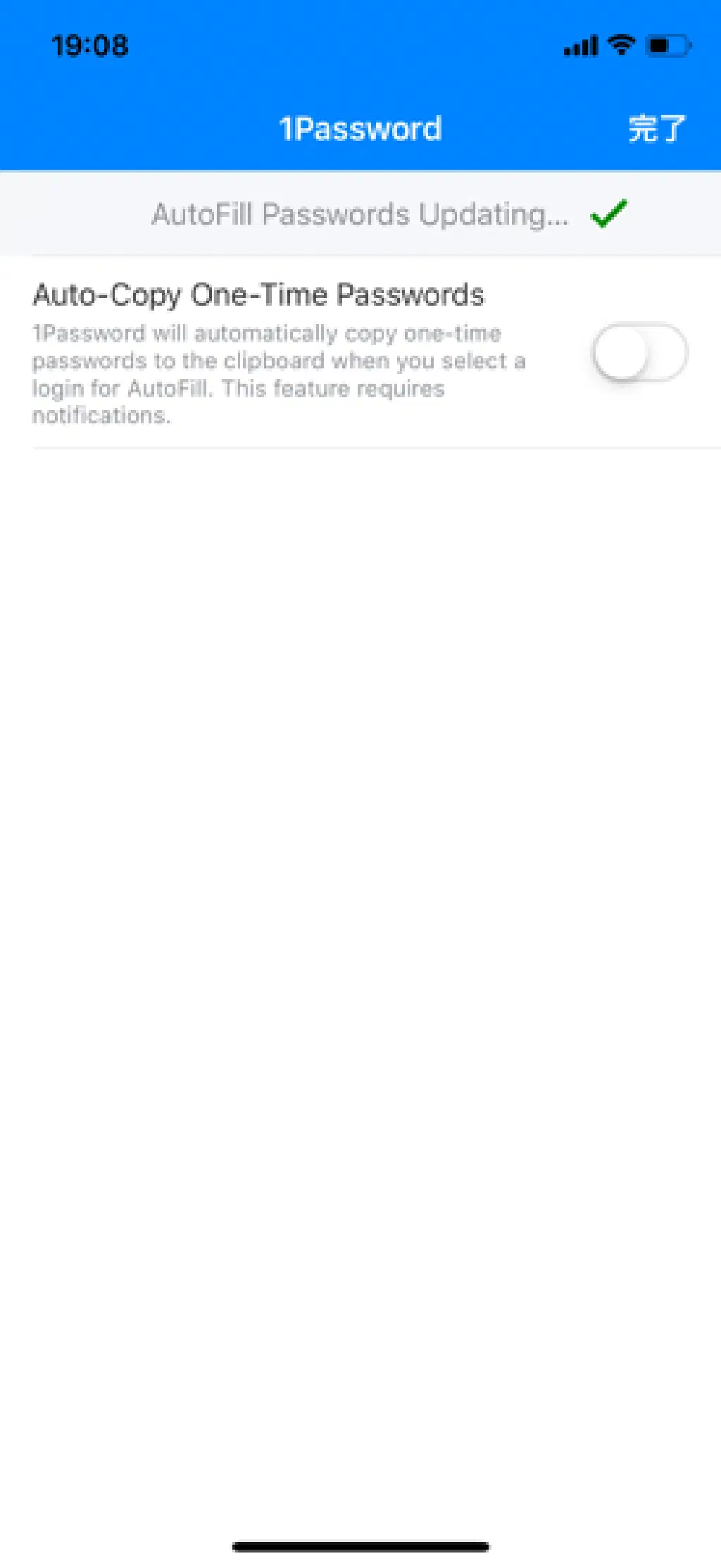 ほぼ何もすることはありません。先ほど「設定」アプリで「1Password」をタップしたら、自動的に上図の画面に遷移します。遷移しなかった場合は、「1Password」の設定から「Password AutoFill」をタップします。