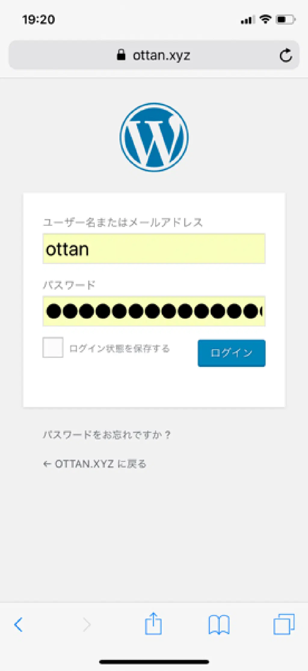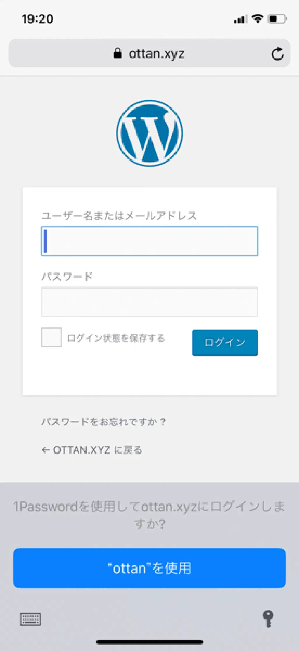 弊サイトのログイン画面を表示した瞬間、画面下部に「1Passwordを使用し〜」という文言とともに、青いボタンが現れますので、そちらをタップします。