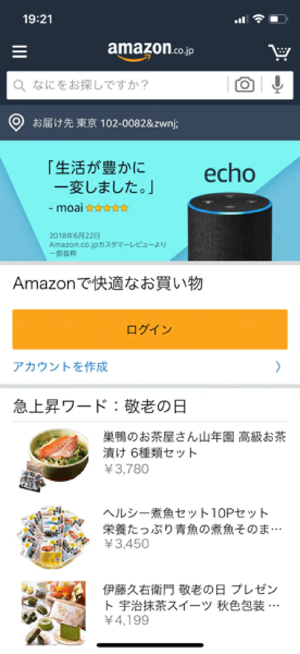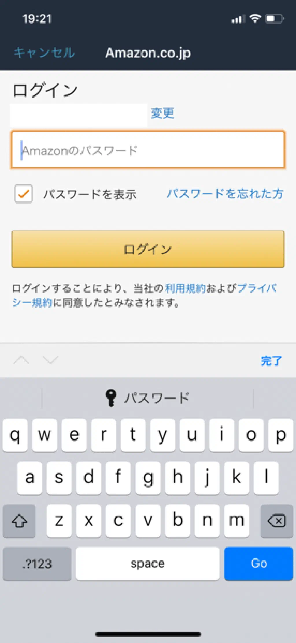 今回、検証したアプリは「Amazon」です。早速「ログイン」をタップします。Amazonの場合、まず登録しているメールアドレスの入力欄が表示されます。この段階では1Passwordは機能しませんでした。期待が少し薄れてしまったのですが、しぶしぶユーザー辞書に登録されているメールアドレスを入力後、次の画面へ遷移すると・・・。