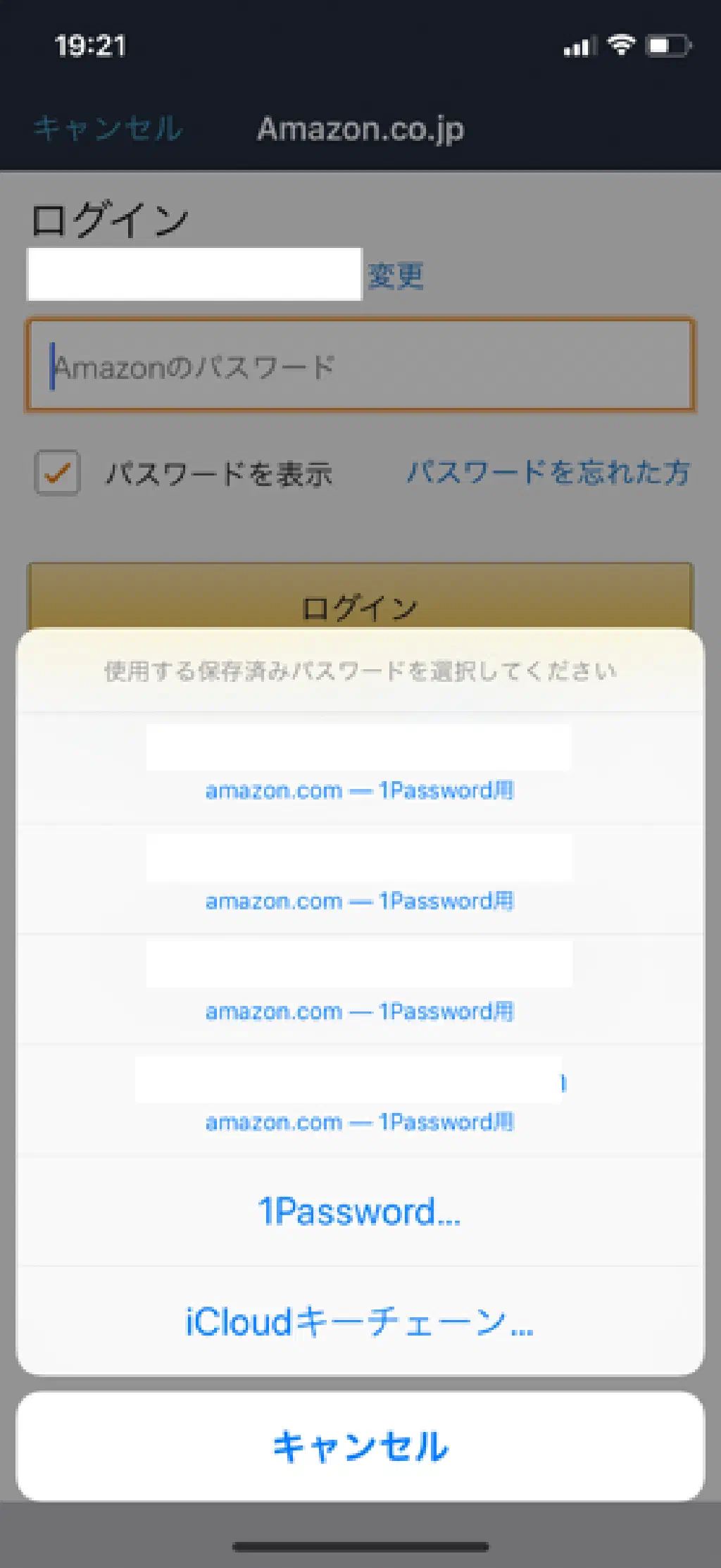 候補が複数表示されました!確かに、Amazonに関して言えば「amazon.co.jp」「amazon.com」の他に「Amazon Web Services」用のアカウントも登録してあるため、複数の候補が表示されたようです。Amazonの通常ログインに表示する項目を選択すると・・・。