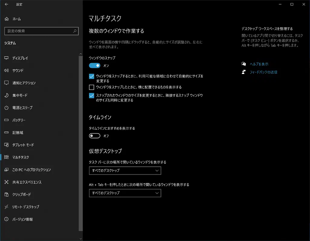 - 「ウィンドウをスナップしたときに、横に配置できるものを表示する」をオフ
