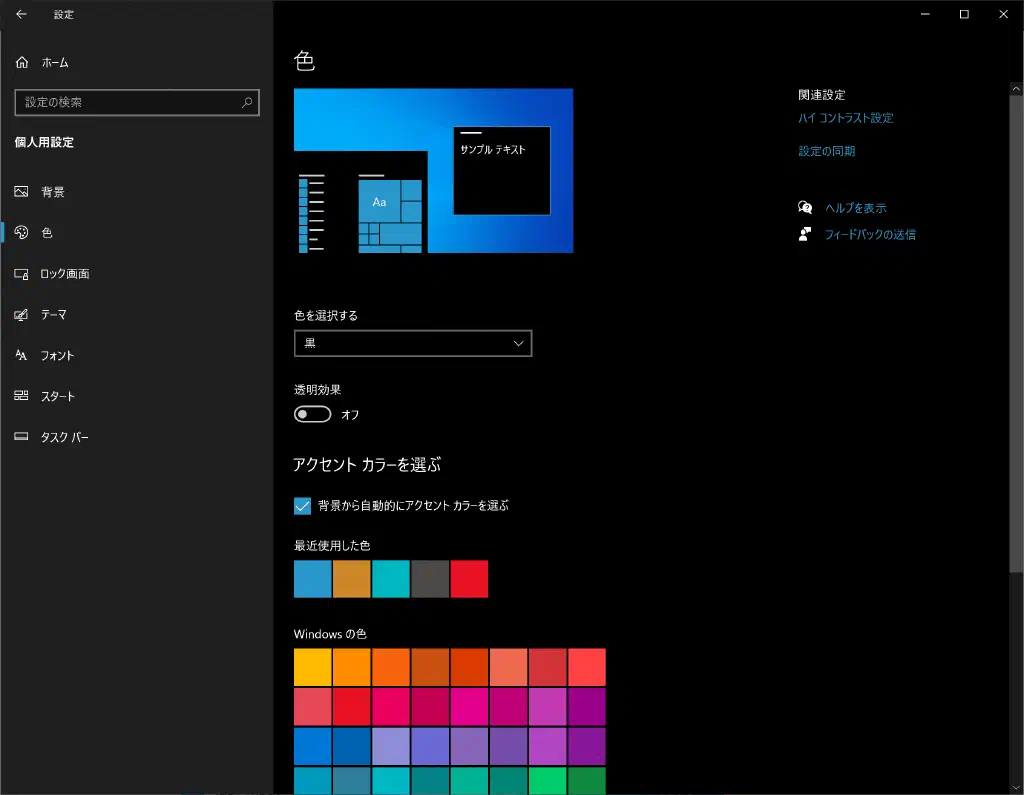体がすっかりダークモードに馴染んでしまった今、「黒」以外の選択肢が考えられません。また、ウィンドウの背景が半透明になる効果は不要のためオフにしています。Windows 7のAero(エアロ)機能に似ていますが、個人的には見づらくなるだけ、また若干CPUへ負荷がかかっている気がするためオフ推奨です。
