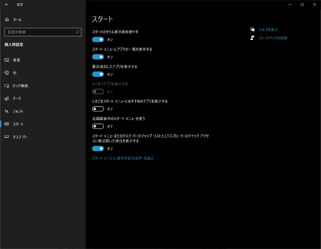 スタートメニューに関しては表示数を増やし、余計なお世話機能シリーズをオフにすることで良いと思います。また、デフォルトでオフになっているため変更することはないと思いますが、「全画面表示のスタートメニュー」という気の狂ったメニューがありますが触れないでおきます。
