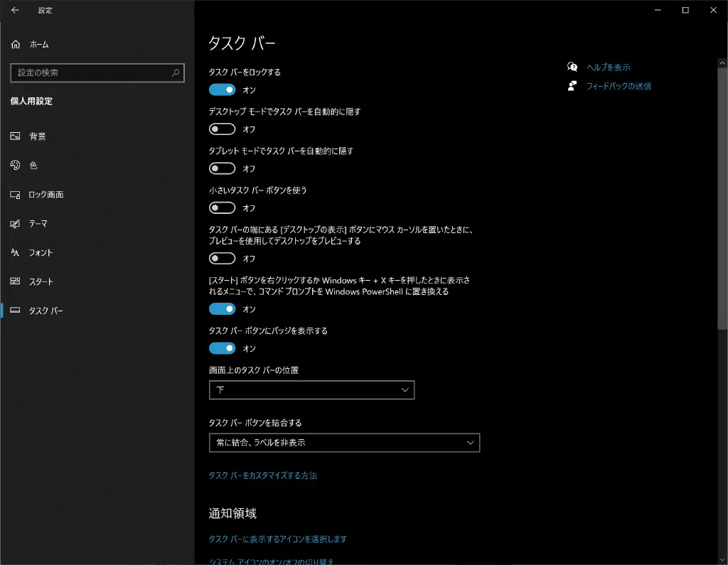 タスクバーはお好みで。画面を少しでも広く使いたい場合は、「デスクトップモードでタスクバーを自動的に隠す」をオンにします。起動しているアプリを把握したかったため、常に表示しています。macOSでもDockは常に表示する派です。