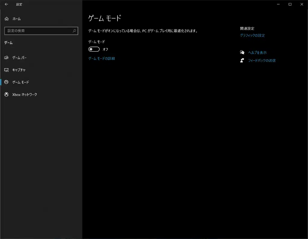 デフォルトで「オン」の厄介な機能です。ゲームモードをオンにすることで、一部のアプリケーションやゲームのベンチマークが(微妙に)向上する、もしくはウイルススキャンやWindows Updateを止めてゲームを優先する、という機能なのですが、トラブルしか耳にしないので即オフにしています。ゲームはしないので「オフ」で。