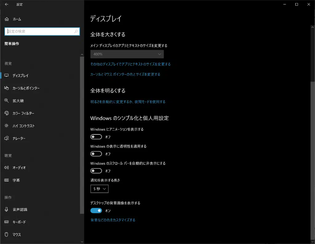 - 「Windowsのスクロールバーを自動的に非表示にする」をオフ