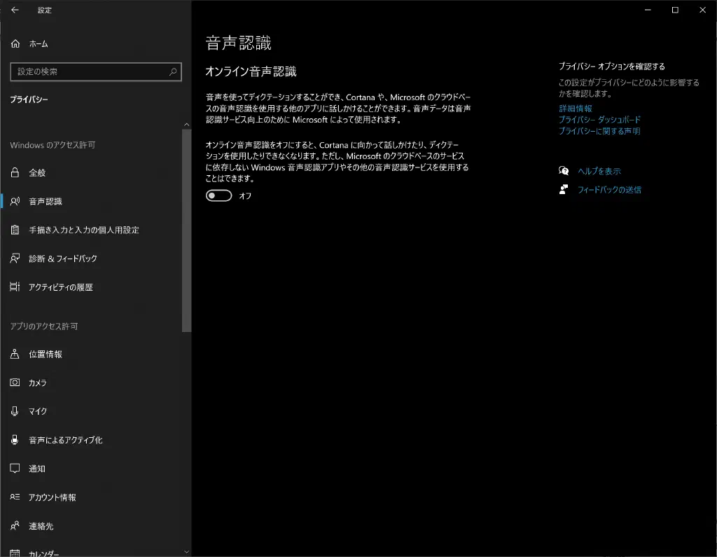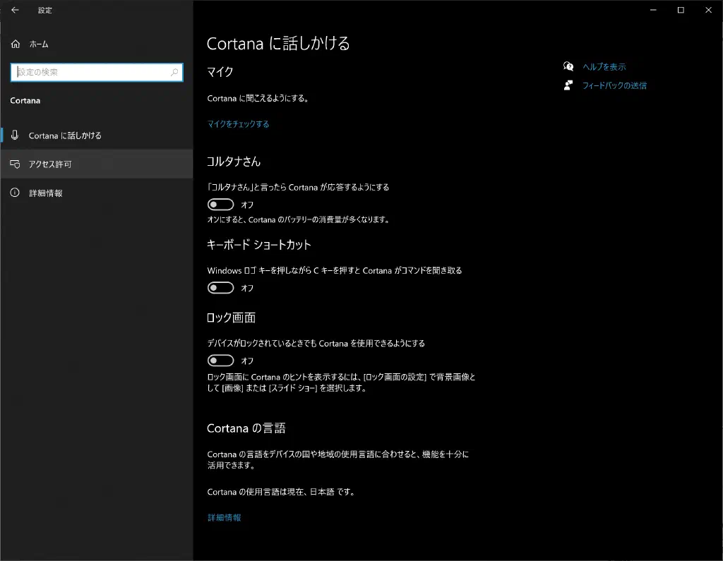 Windows 10を長らく使用していますが、これまでコルタナさんに話しかけたことはないため、すべての項目を「オフ」です。