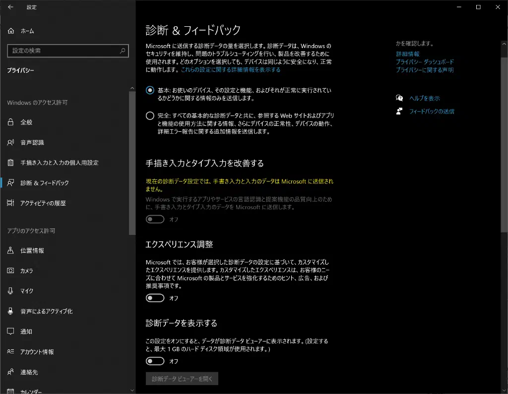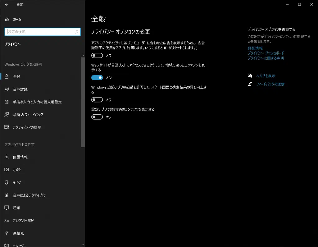 Microsoftに個人情報は渡さないぞ、くらいの気持ちですべてをオフにします。ただし、Webサイト表示時に、日本語ページが用意されているにも関わらず、英語ページがデフォルトで表示されるのは嫌なので、「地域に適したコンテンツ〜」のみオンにしています。ただ、オン、オフのいずれにおいても、Webサイト表示が変更された試しがないため、「オフ」でも良いかもしれません。