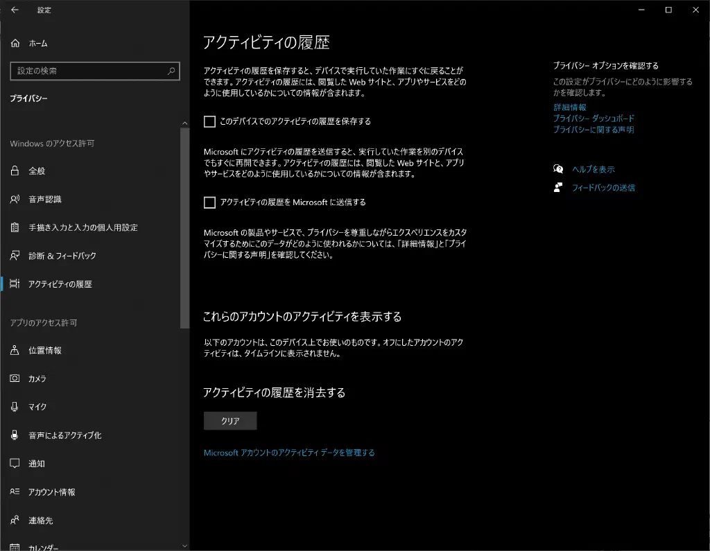 - 「アクティビティの履歴をMicrosoftに送信する」