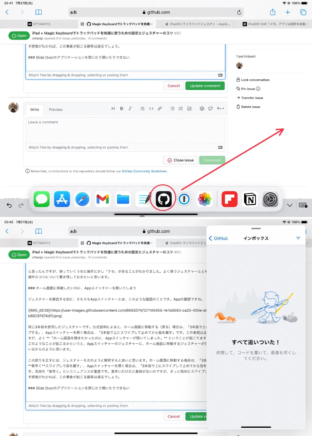 トラックパッド自体は非常に快適です。iPadの画面に触れることもなかなか少なくなります。このブログもGitHubのIssueを経由して書いていますが、iPadの画面に一切触れることなく作業できました。快適なトラックパッド生活を!